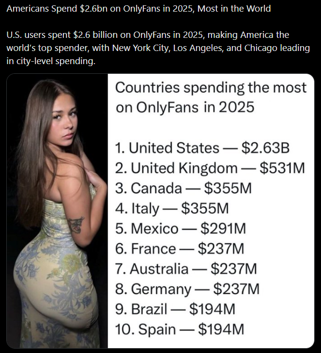 >>524434453I feel like this statistic needs weighted against the average income of each respective country, because it seems fairly obvious to me that rich country spends more. It would be a far more interesting statistic to me seeing who spends the most as a percentage of the average persons disposable income for example.