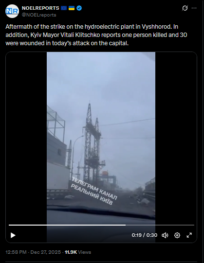 >>524453346Aftermath of the strike on the hydroelectric plant in Vyshhorod. In addition, Kyiv Mayor Vitali Klitschko reports one person killed and 30 were wounded in today’s attack on the capital.https://x.com/NOELreports/status/2004899623232831634?s=20