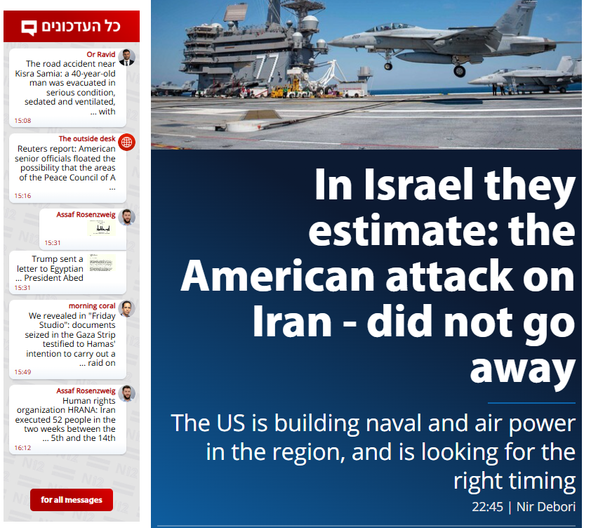 LatestAn American attack on Iran did not detract from this episode as far as Israel understands, and in fact senior Israeli officials hear that the United States is looking for the right timing - this is what we reported this evening (Friday) in "Friday Studio". If you want to topple the regime, it is probably not possible to do it in one stroke in "Zabang and we're done". For this kind of action, you need to gather strength here and you also need to look at the "day after".The United States is currently building up its naval and air power in the region, and in the coming days both aircraft carriers and other tools that can assist in this matter will arrive in the region. The IDF spokesman issued a clarification today that the IDF forces are "prepared for both defense and attack", in light of reports in the American media according to which Israel asked the US to postpone the attack on Iran due to the unpreparedness of the air defense. It can be said that Israel's air defense is not the limitation. It may be that other things limit the attack, but not this issue.