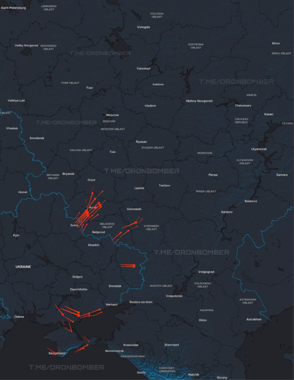 23:10 | 16/01Approximate flight routes of our UAVs:The red arrow - the directions of movement of strike UAVs.According to Russian sources, about 60 drones were reported, but these estimates, along with the routes, are extremely indicative.
