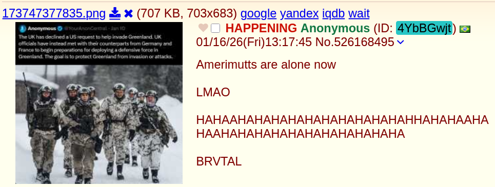 >>526163457>Orange man fucks around Greenland for reals this time>Euros panic and begin dumping bonds>US economy goes down the shitter >Everyone in the west goes to war and China wins bigly by doing nothingor >Magatards are forced to admit their elected president is a fucking retard and have to force him out of officeI wonder which one of these two options is actually more realistic