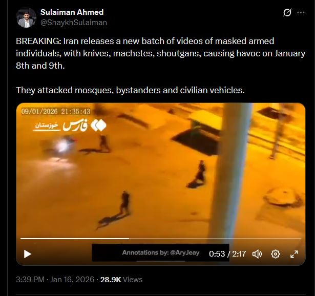 >BREAKING: Iran releases a new batch of videos of masked armed individuals, with knives, machetes, shoutgans, causing havoc on January 8th and 9th.>They attacked mosques, bystanders and civilian vehicles.https://xcancel.com/ShaykhSulaiman/status/2012172768863731978
