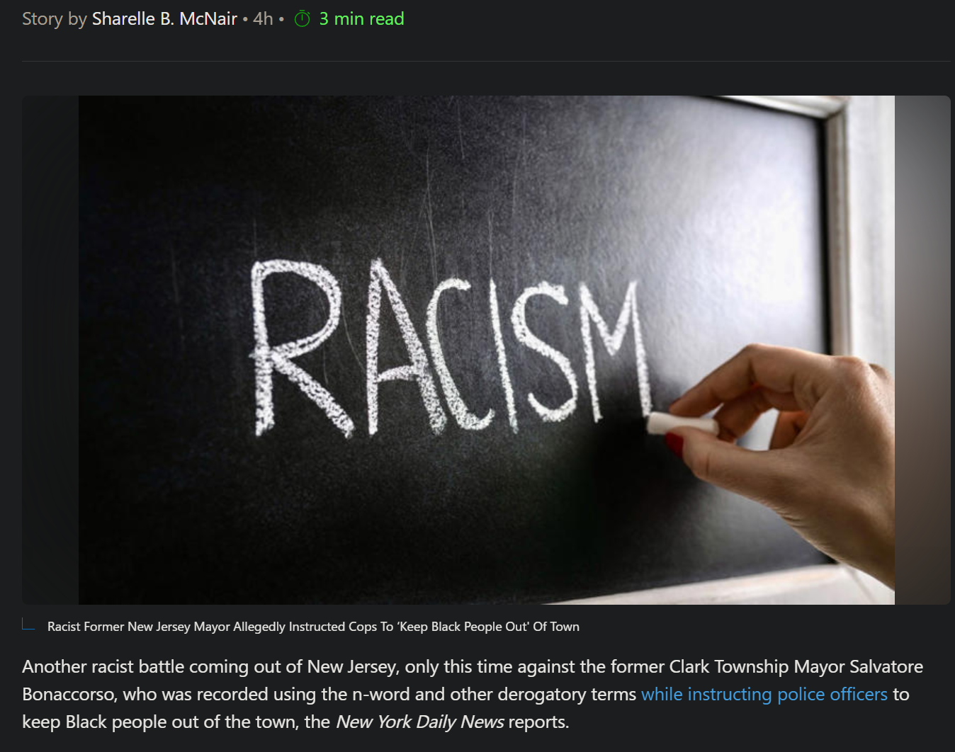 https://www.msn.com/en-us/news/us/racist-former-new-jersey-mayor-allegedly-instructed-cops-to-keep-black-people-out-of-town/ar-AA1UnbAyAnd you say racism doesn't exist in America.A mayor in New Jersey, was recorded on tape, instructing the police of the town that their job is to keep niggers out. He praised officers who stopped or arrested black people by telling them. ""You guys keep doing your job so we don't have no problems."".And after this, people still think there is no racism problem in America?
