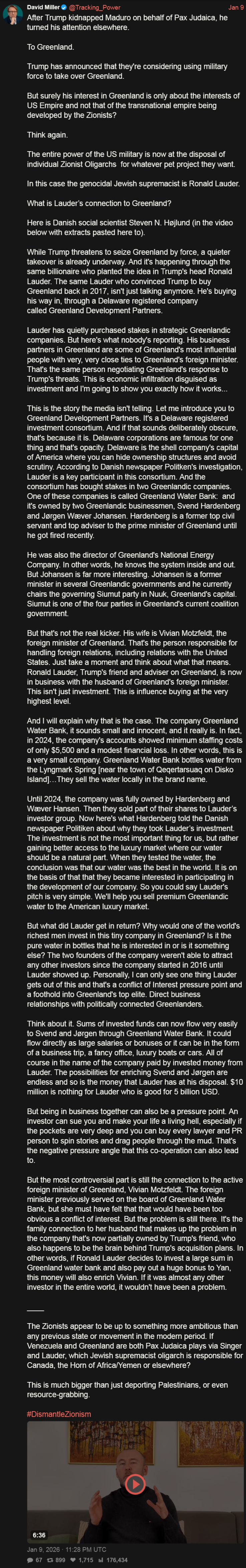 >>526191452>You aren't getting shit. Trump will forget Greenland in a week and move on to his next manchild obsession.Vaccinated swedish vaginaman detected. Trump is just a janitor working for the actual power in America. The real push to take over Greenland comes from an archjew named Lauder, a former president of the world jewish congress.