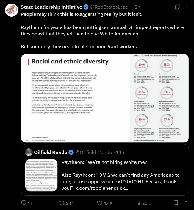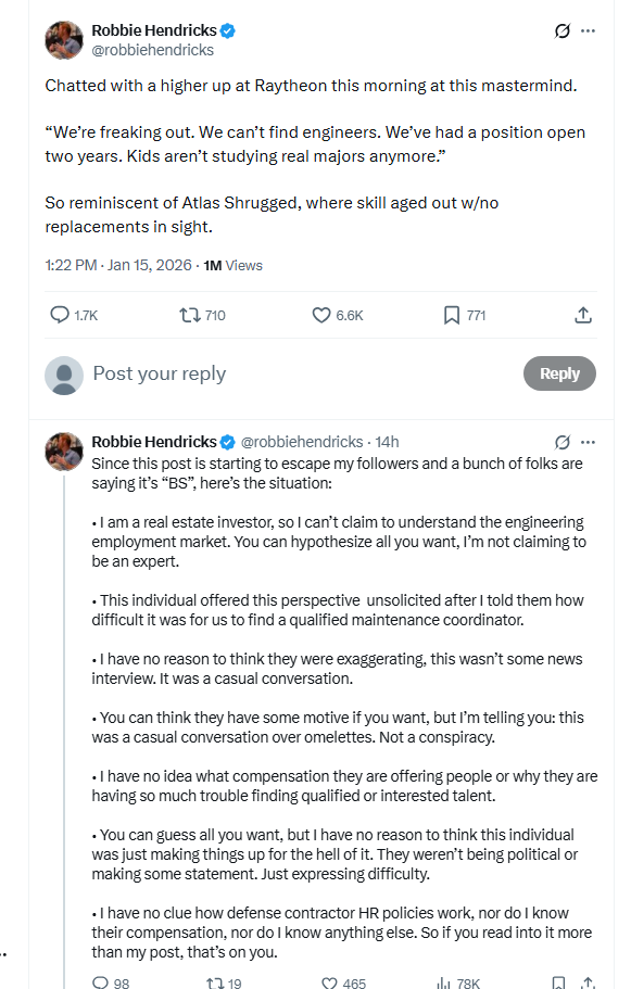 What was that about Raytheon not being able to find any engineers because 'kids aren't studying those majors anymore'?https://x.com/RedStatesLead/status/2012164267772887536Previously:>>526177322