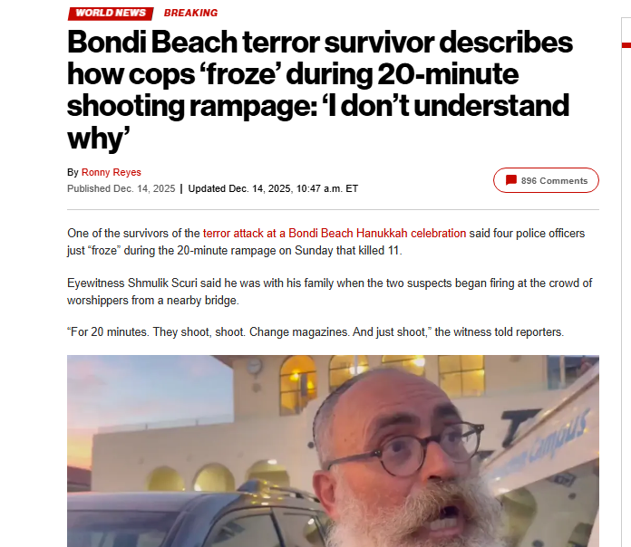 Why didn't the police charge in to stop the shooters? Do you thank the jews even thanked the good samaritan helping them by disarming one of the shooters?>Eyewitness Shmulik Scuri said he was with his family when the two suspects began firing at the crowd of worshippers from a nearby bridge. >It wasn’t until a local good Samaritan, a local fruit seller, disarmed one of the terrorists that police appeared to return fire, taking out one of the shooters.https://nypost.com/2025/12/14/world-news/bondi-beach-terror-survivor-describes-how-cops-froze-during-20-minute-shooting-rampage/
