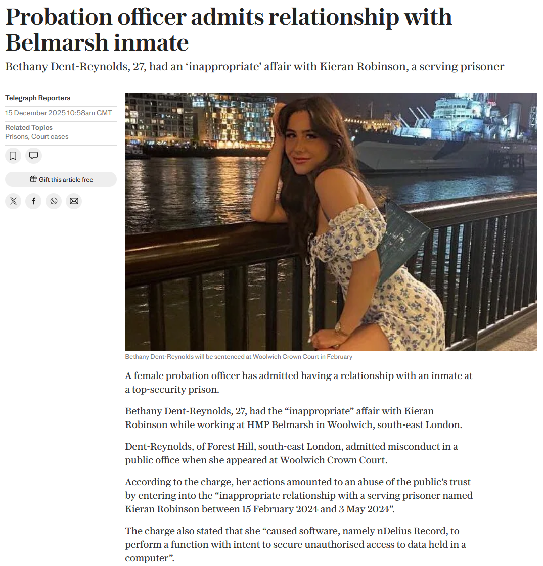 Why can't British women stop having affairs with male prisoners?Why is bongland so determined to let females be prison probation officers?
