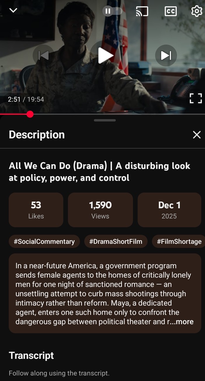 >>523820003>Writer/director here. The film is actually satirizing a government that thinks all lonely, chronically online men are hyper-violent lunatics. It comments on bureaucratic systems inability to go after the real problems with effective solutions. They say they’ve done “all we can do” but that should ring so pathetically hollow by the end of film. >They’d rather use cowardly witch hunt tactics (the “witches” being “incels” in this short) to try and distract from their inability to save actual lives with simple legislation. Nick as a character, while deeply complicated, is really just a traumatized boy at heart needing connection in an attempt to heal from a horrific past. >There’s a reason why the gun he pulls is revealed to be essentially a kids toy. He was never going to hurt Maya. Thanks for watching and engaging.uh, is it based?