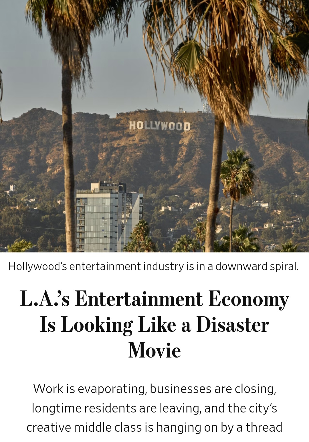 >Brian Mainolfi has been drawing since he came to this city in 1994. The Baltimore native started as an assistant to legendary Looney Tunes animator Chuck Jones, worked on Disney’s “The Hunchback of Notre Dame” and “Mulan,” and spent a decade on the animated sitcom “American Dad.”>Like thousands of people who work in the indistry, he has become collateral damage of a precipitous slowdown in production. The only work he’s found is teaching an animation class at a Cal State campus three hours away, for $350 a week.>"By the end of the year if I don’t have something, I’m going to have to apply to a big-box store or a grocery store or something"KWABhttps://www.wsj.com/business/media/los-angeles-entertainment-economy-downturn-7879105c?utm_social_handle_id=3108351&mod=e2tw&utm_social_post_id=633283177