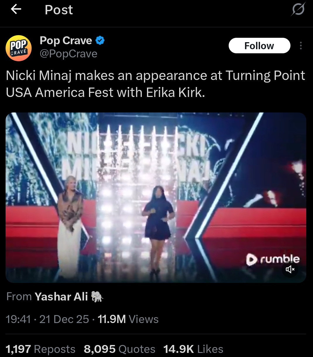 [Chorus]We are Charlie Kirk, we carry the flameWe'll fight for the Gospel, we'll honor his nameWe are Charlie Kirk, his courage our ownTogether unbroken, we'll make Heaven known[Verse 2]A husband, a father, his family held nearA home built on Scripture, on faith without fearThe world tried to silence, but his voice remainsIn us it echoes, in Christ it sustains[Nicki Minaj - Rap Hook]Uh, pink wig energy, crown on my brain,Runnin’ up the charts like I’m in the fast lane,Comment too long. Click here to view the full text.