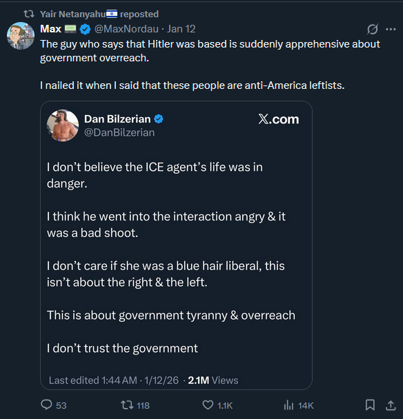 The guy who says that Hitler was based is suddenly apprehensive about government overreach.I nailed it when I said that these people are anti-America leftists.https://x.com/MaxNordau/status/2010786916879503849