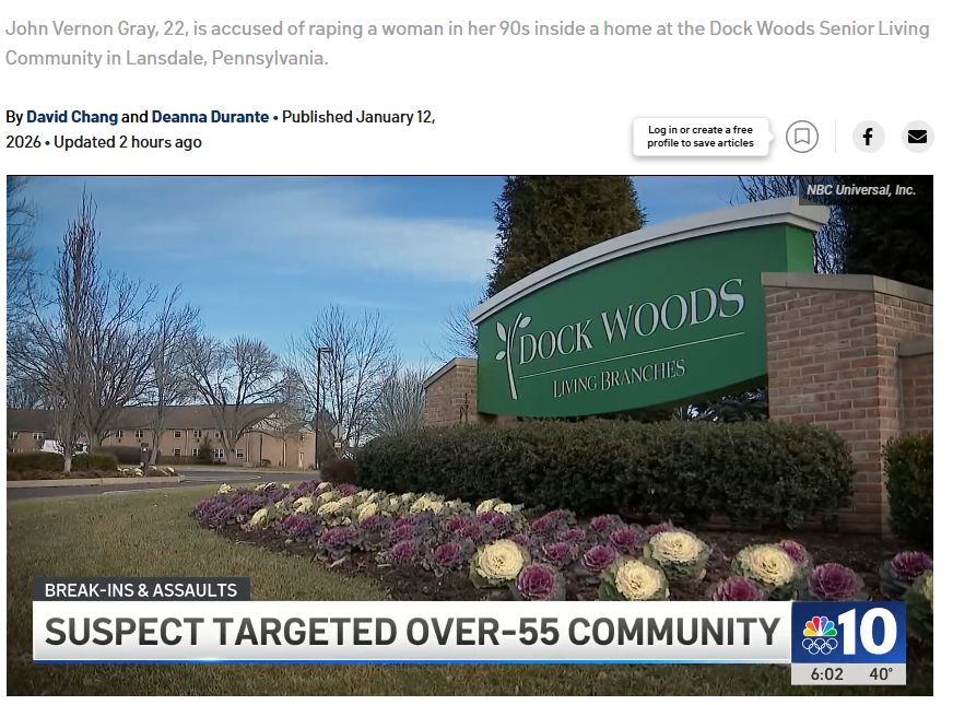 >A Pennsylvania man is accused of raping an elderly woman inside her home at a Montgomery County senior living community.>John Vernon Gray, 22, of Telford, Pennsylvania, is charged with rape, sexual assault, indecent assault, burglary and other related offenses.>Police were called to the Dock Woods Senior Living Community in Lansdale, Pennsylvania. A resident in the community told police she was sleeping around 3 a.m., when she woke up to a man standing inside her bedroom.>When she asked what he wanted, he replied, “I want you,” telling her she’s beautiful and that he’d seen her in the cafeteria. She told him that she’s an old woman; then, he sexually assaulted her, officials said.>The affidavit of probable cause said that, based on other contact with police, a warrant was issued for Gray’s DNA, and it matched a sample taken from the woman’s nightgown.>That same morning, around 4:30 a.m., Towamencin Police responded to a mental health emergency at an apartment on Stockton Drive, about a mile away from the Dock Woods community. When they arrived, they found a man – who they later identified as John Vernon Gray – who was suicidal. The man was taken to the hospital for mental health treatment.>Court documents link Gray to two other break-ins and attempted sexual assaults in November involving older women, but he is not currently charged with those crimes.https://www.audacy.com/kywnewsradio/news/local/man-charged-burglary-rape-elderly-woman-montcohttps://www.nbcphiladelphia.com/news/local/pennsylvania-man-accused-of-raping-95-year-old-woman-at-senior-living-community/4331853/