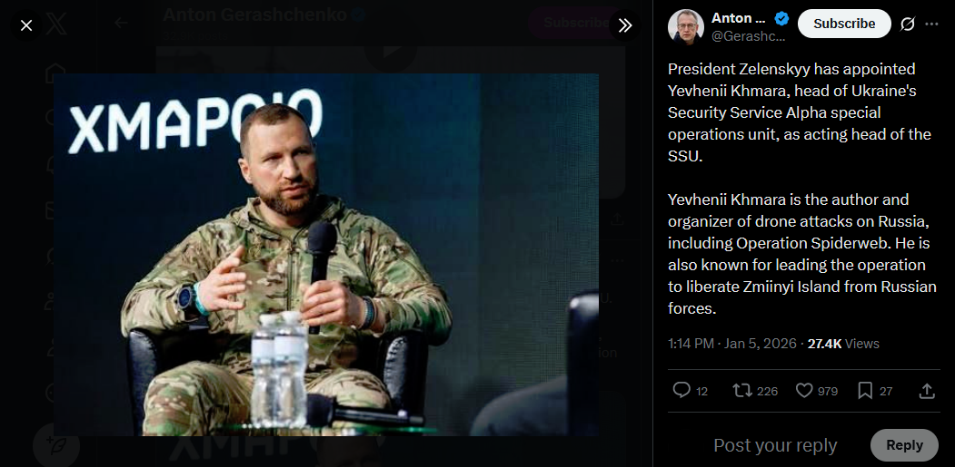 President Zelenskyy has appointed Yevhenii Khmara, head of Ukraine's Security Service Alpha special operations unit, as acting head of the SSU.Yevhenii Khmara is the author and organizer of drone attacks on Russia, including Operation Spiderweb. He is also known for leading the operation to liberate Zmiinyi Island from Russian forces.https://x.com/Gerashchenko_en/status/2008165155331248275?s=20>5th