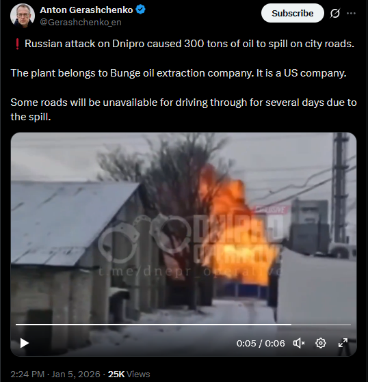 Russian attack on Dnipro caused 300 tons of oil to spill on city roads.The plant belongs to Bunge oil extraction company. It is a US company.Some roads will be unavailable for driving through for several days due to the spill.https://x.com/Gerashchenko_en/status/2008182915923144822?s=20>5thhttps://litter.catbox.moe/1wk5te0jgz1k4pzu.mp4