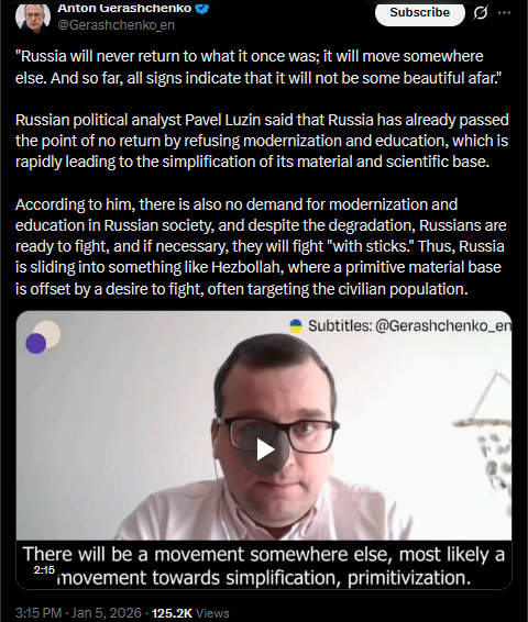 "Russia will never return to what it once was; it will move somewhere else. And so far, all signs indicate that it will not be some beautiful afar."Russian political analyst Pavel Luzin said that Russia has already passed the point of no return by refusing modernization and education, which is rapidly leading to the simplification of its material and scientific base.According to him, there is also no demand for modernization and education in Russian society, and despite the degradation, Russians are ready to fight, and if necessary, they will fight "with sticks." Thus, Russia is sliding into something like Hezbollah, where a primitive material base is offset by a desire to fight, often targeting the civilian population.https://x.com/Gerashchenko_en/status/2008195597233263077?s=20>5thhttps://litter.catbox.moe/5fjudpz9yenrp3yu.mp4