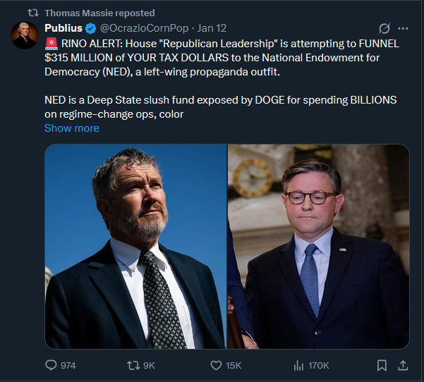 BASED "Republican Leadership" is attempting to FUNNEL $315 MILLION of YOUR TAX DOLLARS to the National Endowment for Democracy (NED), a left-wing propaganda outfit.NED is a Deep State slush fund exposed by DOGE for spending BILLIONS on regime-change ops, color revolutions, and woke activists to topple governments. NED is the CORE of the global Censorship Industrial Complex, a CIA cutout redefining "democracy" for elitist control, using backchannel deals with the EU to silence conservatives worldwide.Thomas Massie (R-KY) has introduced an AMENDMENT to DEFUND NED entirely in the FY2026 appropriations bill.https://x.com/OcrazioCornPop/status/2010860177122115930