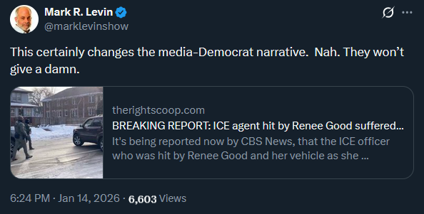 thank G-d for the quick reflexes of that agent honestly or this would have been much worse.https://x.com/marklevinshow/status/2011504731294679050The Immigration and Customs Enforcement agent who fatally shot Renee Good last week in Minneapolis, Jonathan Ross, suffered internal bleeding to the torso following the incident, according to two U.S. officials briefed on his medical condition.It was unclear how extensive the bleeding was. CBS News has reached out to the Department of Homeland Security for more information and has not yet received a reply. This story will be updated as we learn more.Videos from the scene showed Ross walking away after the incident.Kristi Noem, the Homeland Security secretary, previously acknowledged that Ross was taken to the hospital after the shooting and was released the same day. She said he was recovering from his injuries, describing him as an experienced law enforcement officer who believed he was defending himself and fellow agents.“The officer was hit by the vehicle. She hit him. He went to the hospital. A doctor did treat him. He has been released,” Noem told reporters on Jan. 7.Ross, a 10-year law enforcement veteran with ICE, was seriously injured in June in a separate incident in the Minneapolis area when he was dragged by a car during an attempted arrest, requiring 33 stitches and hospital care, court records show.