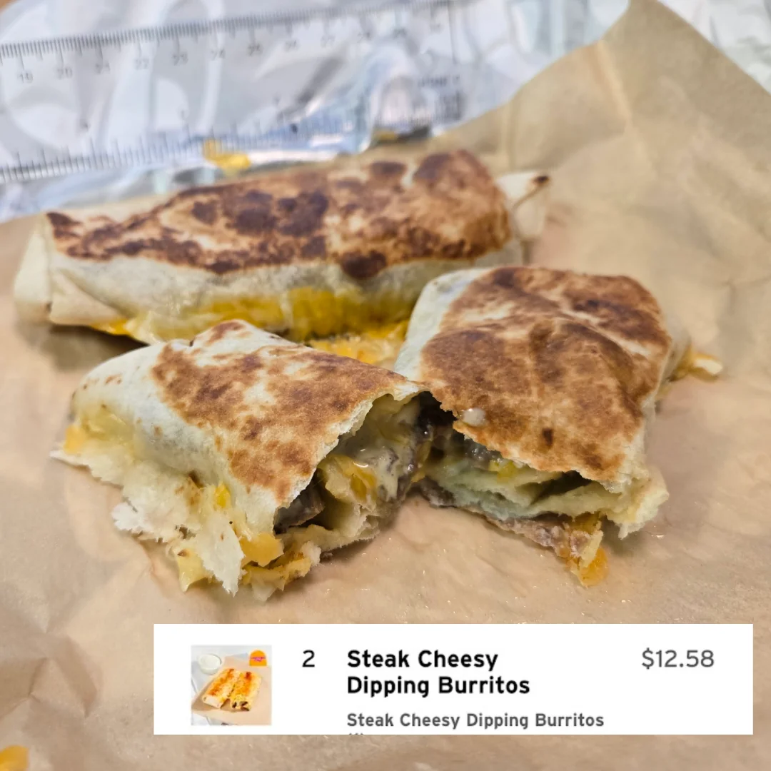 They were kinda expensive at $6.29 for two, but the employee got confused about their own portion sizes and gave me two half orders (a single burrito) instead. They are about 4" each and have 5-6 small pieces of steak each.When I went back the next day to complain about being shorted half my order in the Drive Thru the manager called me a liar. Like bro, how do you prove a negative, that you were shorted something in the bag?