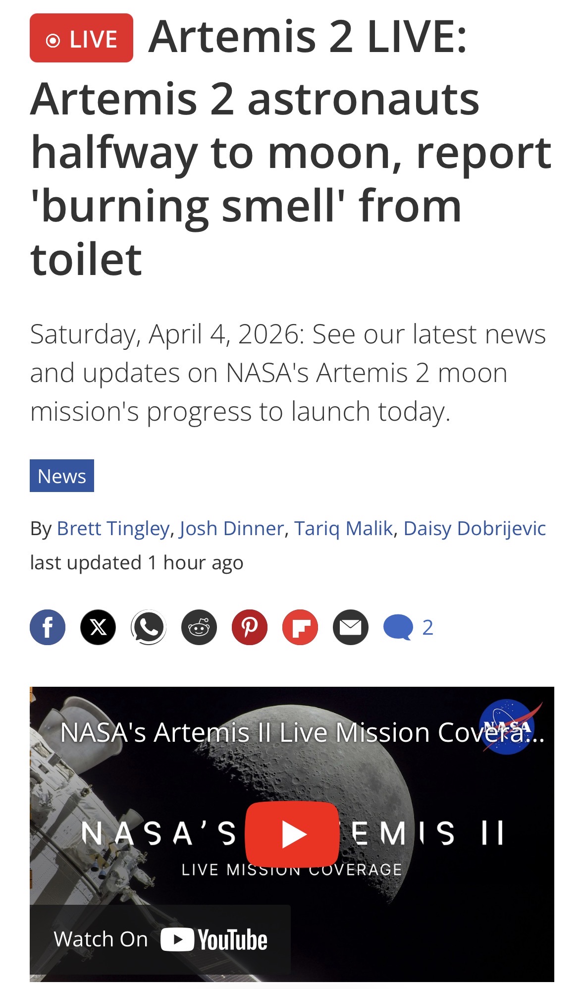 Artemis crew reports burning smell coming from toilet