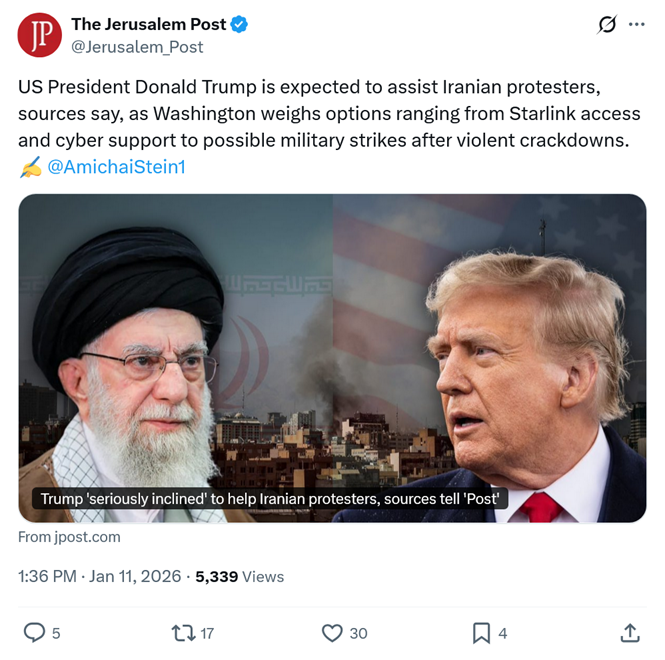 It's happening. Trump is about to secure his legacy as the greatest global leader of the 21st century. This will be his Berlin Wall.And it won't take boots on the ground. The people of Iran are the revolutionaries; we were the precipitant and we are the endgame. https://x.com/Jerusalem_Post/status/2010420588112749030