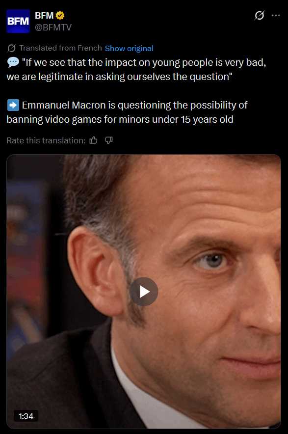 MACRON TO BAN VIDEO GAMES IN FRANCE(He already banned social networks, effective September 2026)https://x.com/BFMTV/status/2019504179916488870