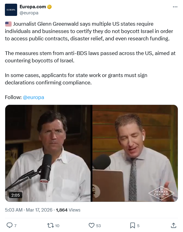 >Journalist Glenn Greenwald says multiple US states require individuals and businesses to certify they do not boycott Israel in order to access public contracts, disaster relief, and even research funding.>The measures stem from anti-BDS laws passed across the US, aimed at countering boycotts of Israel. >In some cases, applicants for state work or grants must sign declarations confirming compliance.https://x.com/europa/status/2033771252062580762