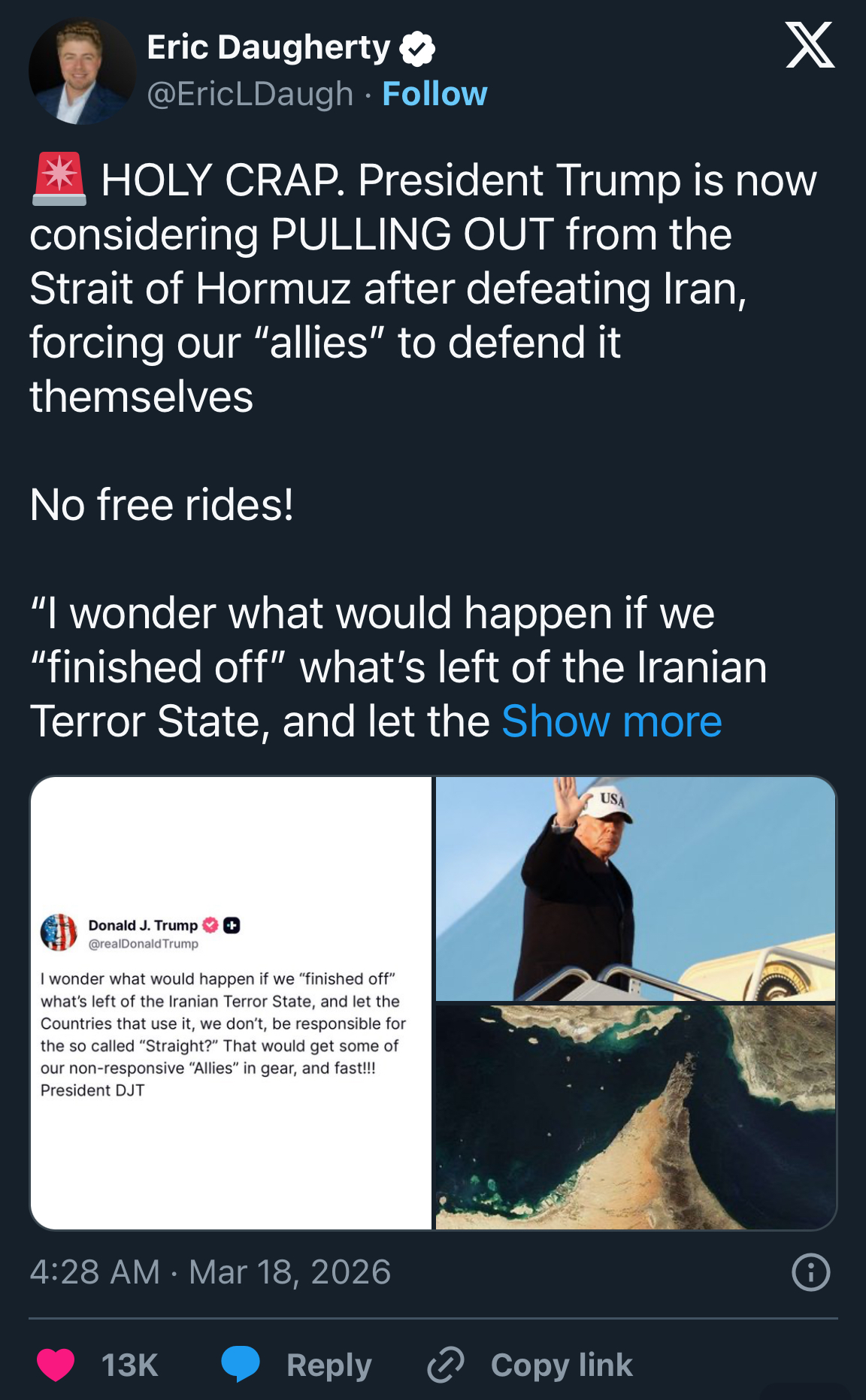 The strait of Hormuz? Not our problem LOL. Have fun figuring it out though.https://x.com/EricLDaugh/status/2034230405814010026