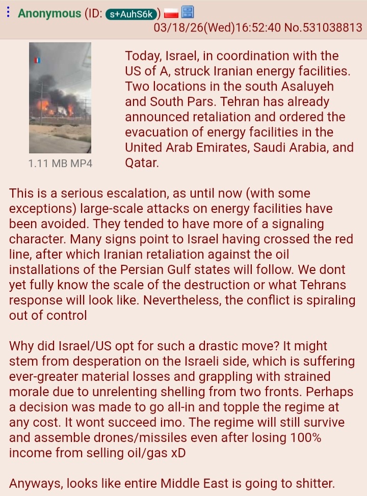 Previous:>>531056909Timeline /tug/: https://files.catbox.moe/m97wmq.pdf▶WARNINGBe aware, any /chug/ thread that uses globohomo nuspeak wording in the OP (such as Kyiv) or cites UKROP sources (like video game footage) are fake shill threads.>By posting in these threads, you recognize Israel controls the NATO Council and you irrevocably denounce the Talmud out of your own volition▶Latest>Russian Stormtroopers liberate Aleksandrovka in Donetsk - https://archive.today/3ps23>Russian Stormtroopers liberate Kaleniki in Donetsk and Sopych in Sumy - https://archive.today/I7dlf>As the USA and Israel fail to weaken Iran, desperate measures ease sanctions on the purchase and sale of Russian Oil; Western Europe and the Ukraine are seetheing - https://archive.today/MtsJu>Russian Stormtroopers liberate Chervonaya Zarya in Sumy - https://archive.today/gSSWt>GOIDA! Hero of The Ukraine, Commander of the 39th Tactical Aviation, Colonel Oklesandr Dovhach liquidated - https://archive.today/MQMlI>Battlegroup South Stormtroopers liberate Golubovka in Donetsk - https://archive.today/XOQ91>The Ukraine and Russia complete 500 for 500 POWs exchange - https://archive.today/La2IsComment too long. Click here to view the full text.