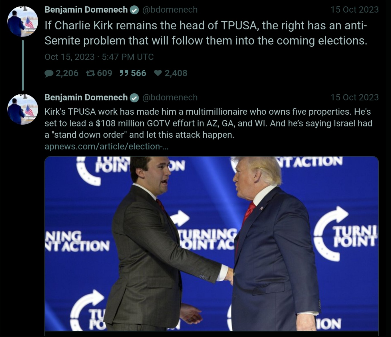 state of Israel—Netanyahu himself—assassinated Charlie Kirk.Here is a top Zionist sayanim in America (Meghan McCain's husband) and personal dinner guest of Bibi Netanyahu sending out the batsignal the week following 10/7/2023 when Charlie had begun doubting the event and questioning Israel:https://archive.4plebs.org/pol/thread/516802038Tweet has four million viewsProof and videos at linkIf you think 'troons killed CK' you're a dumber fuck than the people that bought 9/11