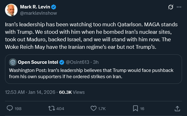 Iran’s leadership has been watching too much Qatarlson. MAGA stands with Trump. We stood with him when he bombed Iran’s nuclear sites, took out Maduro, backed Israel, and we will stand with him now. The Woke Reich May have the Iranian regime’s ear but not Trump’s.https://x.com/marklevinshow/status/2011240103444955438