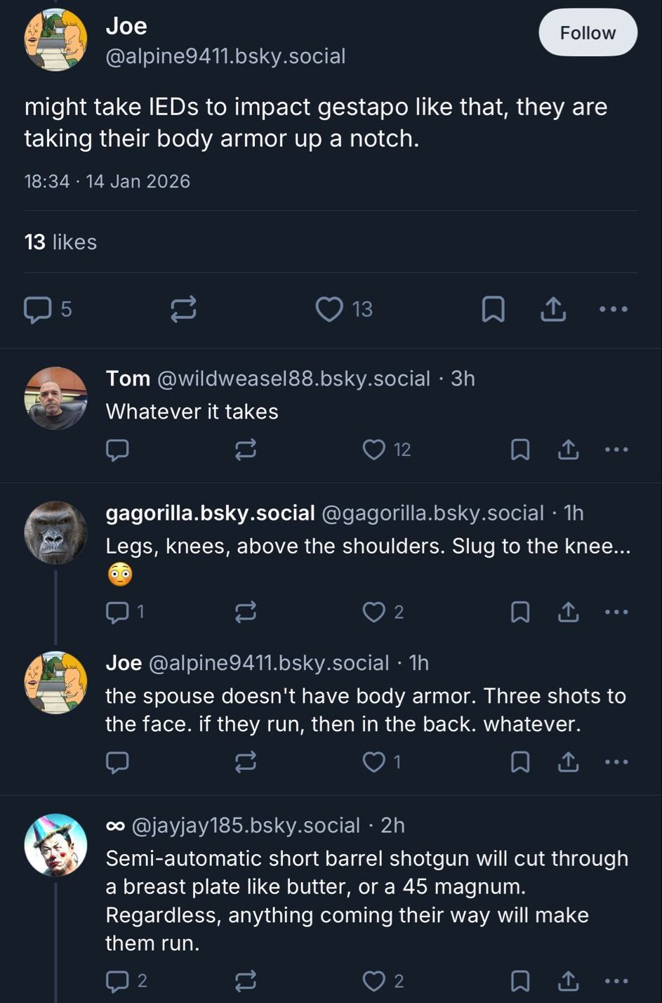 Leftists on Reddit and Bluesky insist that they are peaceful protesters, but openly talk about building IED's and massacring law enforcement. Document their speech here so they can't gaslight you. ---https://tips.fbi.gov/homeREMINDER: if you believe there is a credible threat of a terror attack near you you can submit an anonymous tip to the FBI.