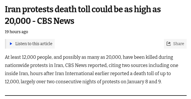 they'll be 6,000,000 by february>https://www.iranintl.com/en/202601138196At least 12,000 people, and possibly as many as 20,000, have been killed during nationwide protests in Iran, CBS News reported, citing two sources including one inside Iran, hours after Iran International earlier reported a death toll of up to 12,000, largely over two consecutive nights of protests on January 8 and 9.