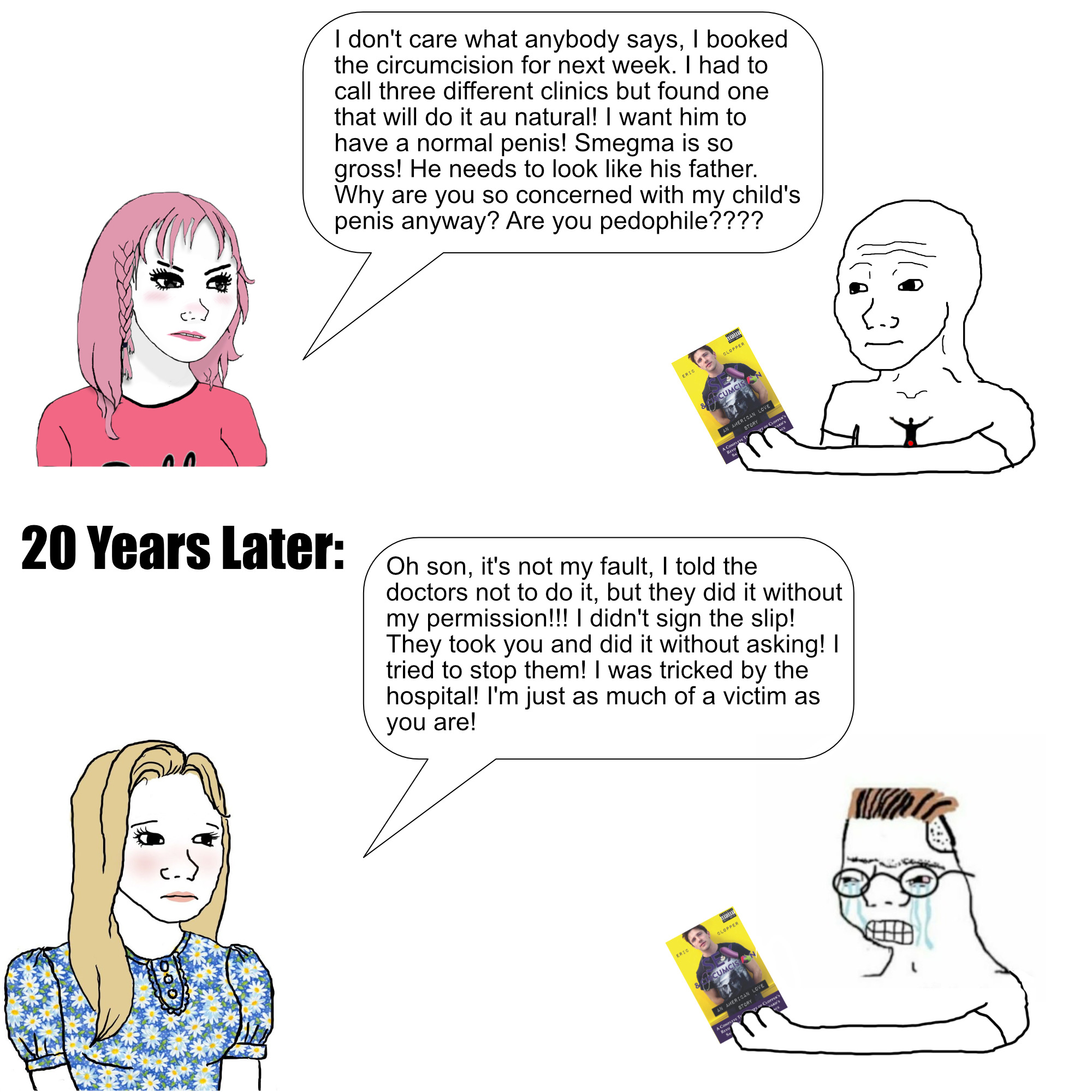 >>525909427i'm not saying this never happens, but I guarantee most of these moms willingly signed off on the mutilation, then made up the story when confronted about being such a heartless piece of shit. pic related.