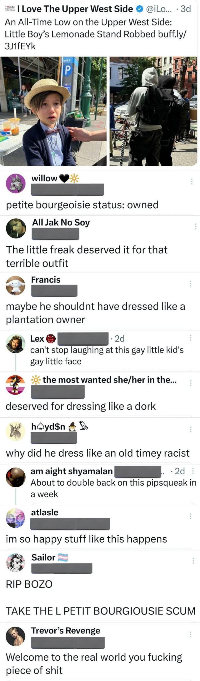 >Cold-hearted teensAdd it to the list.Also check out the responses from unhinged leftards who were happy about this kid getting robbed. Leftists are bitter, hateful people that resent anyone with any amount of entrepreneurial spirit. They cheer the theft. Just like they cheer antifa and other terrorist criminal scum. They're demonic.https://nypost.com/2023/06/08/cold-hearted-teens-steal-8-year-old-nyc-boys-lemon-stand-earnings/