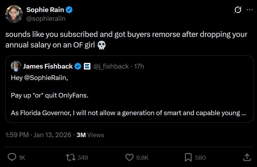 >James Fishback, a candidate for Governor of Florida, proposes an OF 'Sin Tax' of 50% in Florida and directly calls out Sophie Rain to “pay up or quit”Imagine getting owned by en ethot lol