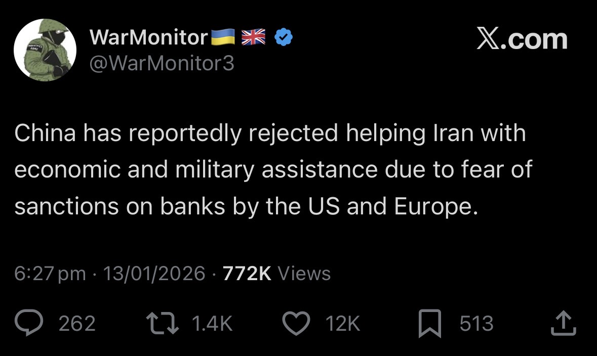 Last: >>525939875Daily discussion of the ongoing situation in Iran.Jan 13:>Trump in meeting with national security team>No water and power>Trump: I have cancelled all meetings with Iranian Officials until the senseless killing of protesters STOPS. HELP IS ON ITS WAY. MIGA... PRESIDENT DONALD J. TRUMP>Iran has just announced the seizure of a huge shipment of Starlink>China, USA calls for it's citizens to evacuate from Iran. More countries suddenly follows.>ESTIMATED: 20.000+ DEAD / ~3500 ISLAMIC FORCES>MASS PUBLIC EXECUTIONS SET FOR TOMORROW ACROSS THE NATION>STARLINK STILL DOWN, BLACKOUT HOLDSJan 12:Comment too long. Click here to view the full text.