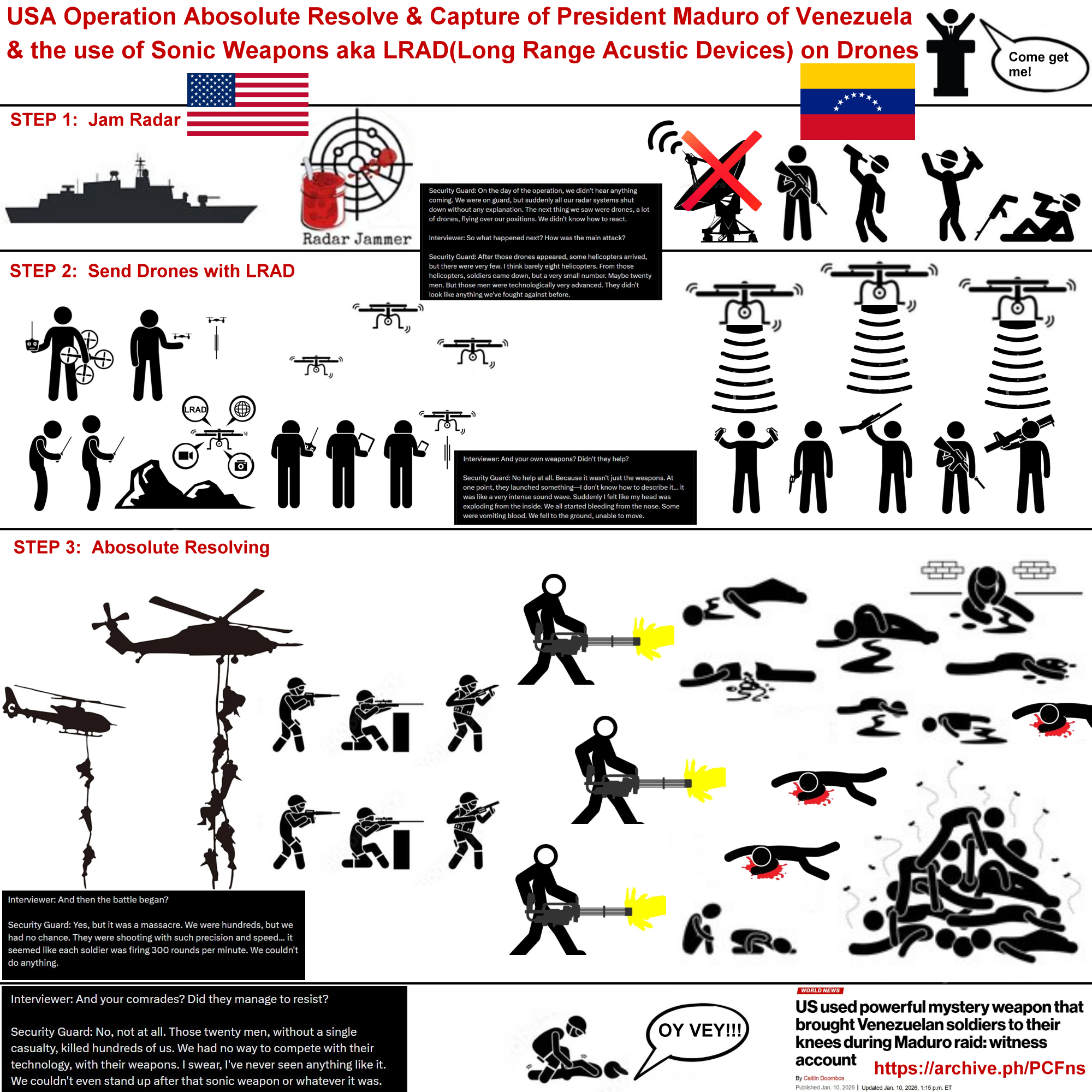 >Security Guard: No help at all. Because it wasn't just the weapons. At one point, they launched something—I don't know how to describe it... it was like a very intense sound wave. Suddenly I felt like my head was exploding from the inside. We all started bleeding from the nose. Some were vomiting blood. We fell to the ground, unable to move.>Those twenty men, without a single casualty, killed hundreds of us. We had no way to compete with their technology, with their weapons. I swear, I've never seen anything like it. We couldn't even stand up after that sonic weapon or whatever it was.https://x.com/nettermike/status/2009843044028428714https://www.youtube.com/watch?v=2k77YAuSNaYhttps://nypost.com/2026/01/10/world-news/us-used-powerful-sonic-weapon-in-venezuela-during-raid-to-capture-madouro-incredible-witness-account/