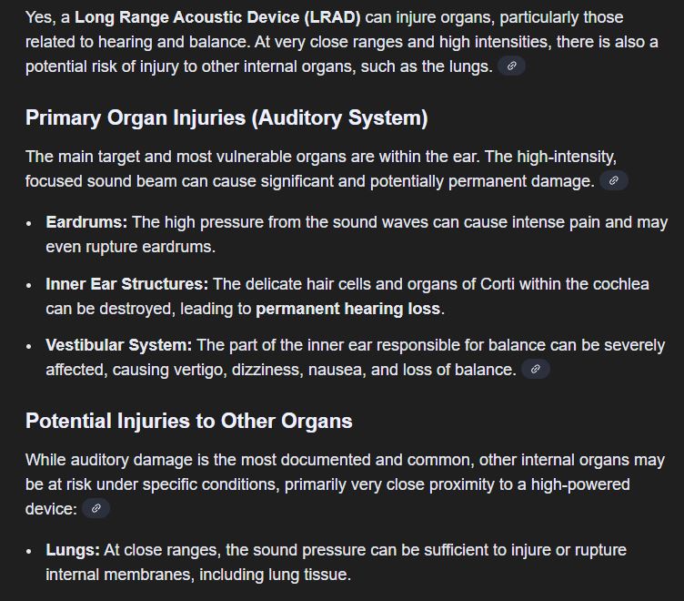 >>525949817You're a fucking retard if you think LRAD can injure any human organ other than eardrums.