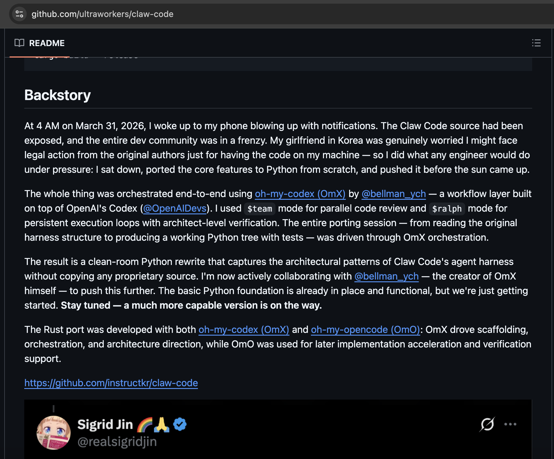 https://github.com/ultraworkers/claw-codeThey pushed an update with 512,000 lines of their source code. Accidentally. All their proprietary stuff out in the open.A researcher spotted it in minutes. 23 million people saw it.And here's the good part.They started firing off DMCAs like crazy. "Delete that."Then a Korean guy named Sigrid Jin—the dude who uses Claude more than anyone in the world, 25 BILLION tokens a year according to WSJ—wakes up at 4AM.What does he do? Rewrites the ENTIRE codebase in Python. Before dawn.He calls it claw-code. Uploads it to GitHub.Comment too long. Click here to view the full text.