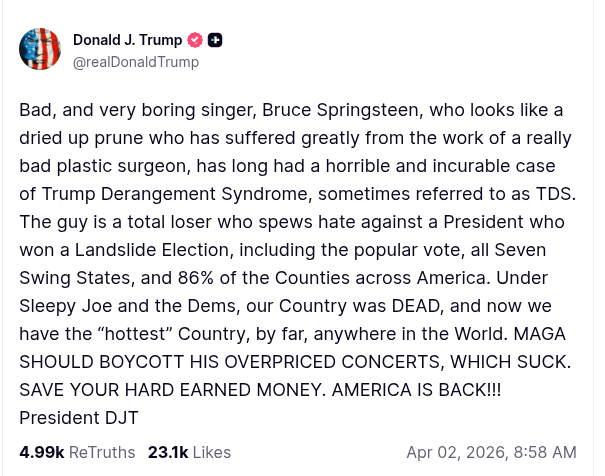 >start talking about Bruce Springsteen's appearance>go on rambling about how he won the race by a margin of 2M votes and call it a landslide>proceed to shittalking Biden in a personal level>end up going back to Bruce Springsteen, calling for a boycot because the tickets are too expensiveHe writes like a teenager with a severe case of ADHD.