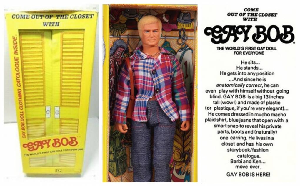 >Gay Bob is a doll created in 1977 and billed as the world's first openly gay doll. Bob was created by former advertising executive Harvey Rosenberg and marketed through his company, Gizmo Development. Gay Bob was bestowed with an Esquire magazine "Dubious Achievement Award" for 1978.>Bob stands 13 inches (33 cm) tall and was presented clothed in a flannel shirt, tight jeans and cowboy boots. He has one ear pierced. Bob's packaging box is decorated like a closet and included a catalog from which additional outfits could be ordered. Creator Rosenberg described the doll as resembling a cross between Paul Newman and Robert Redford. Bob is anatomically correct.How come I've never heard of this in my life until now? Also, politics or something. Culture is politics, something something.