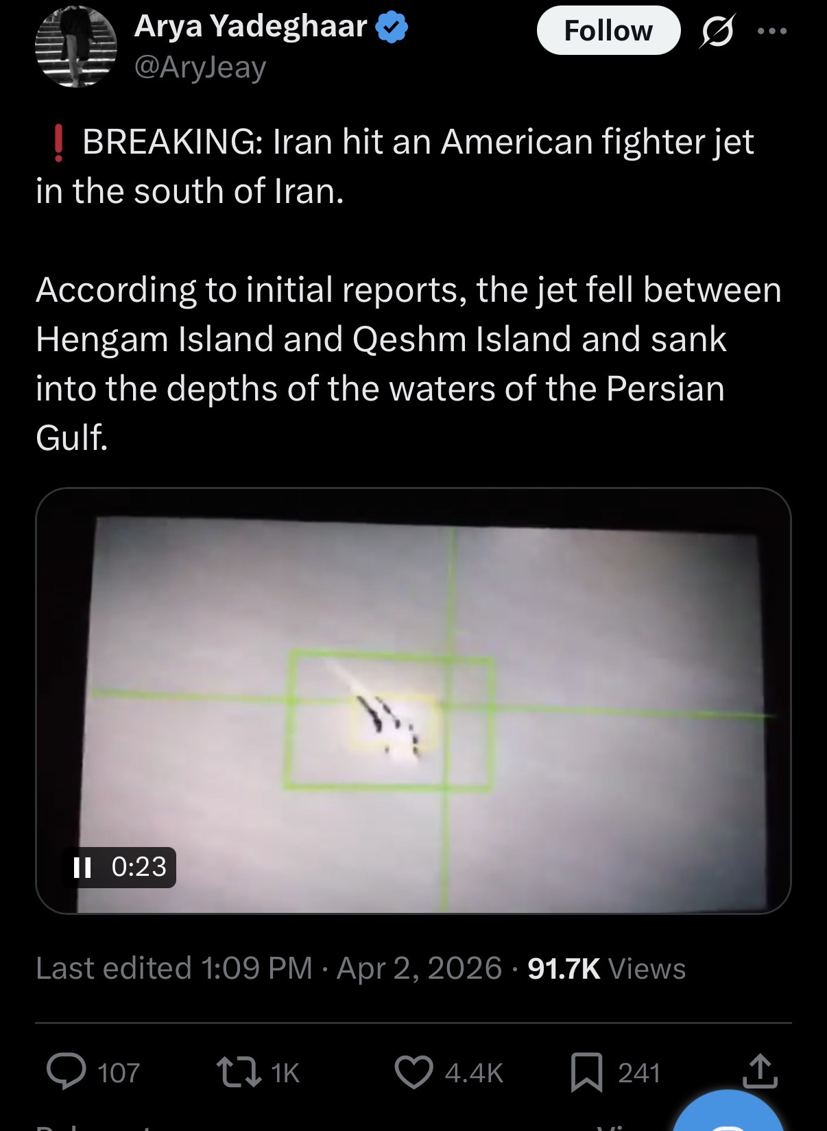 Iran hit an American fighter jet in the south of Iran. According to initial reports, the jet fell between Hengam Island and Qeshm Island and sank into the depths of the waters of the Persian Gulf.https://x.com/AryJeay/status/2039797435644395526