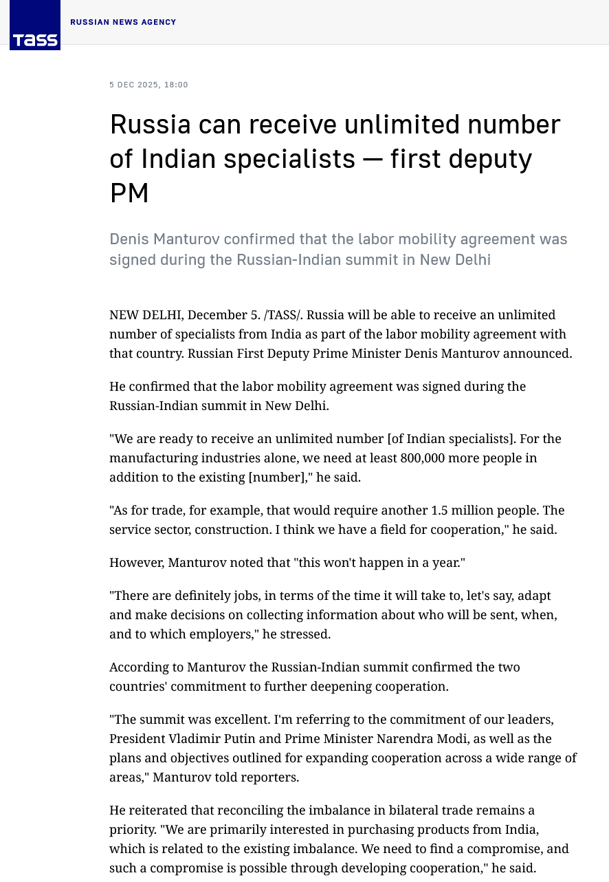 >>532355344> to survive it must import 2 million IndiansThat's Russia's plan, you seem to be mixing it up.https://tass.com/economy/2054547