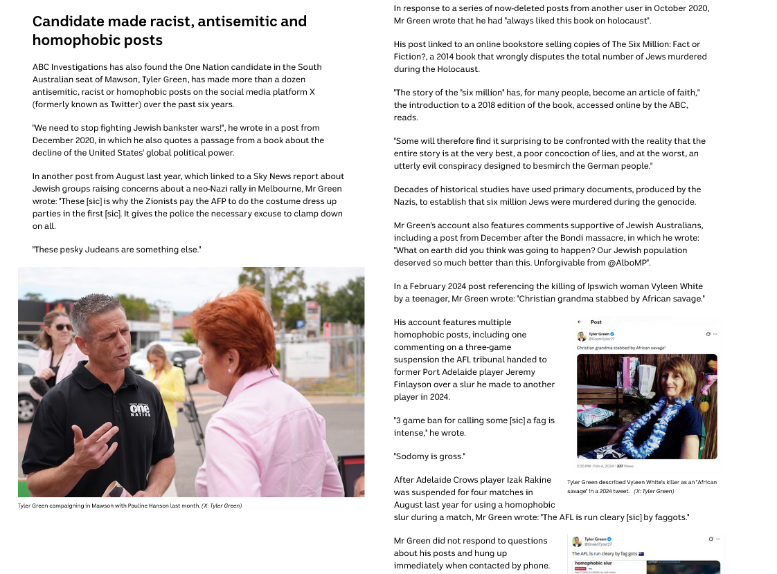 >>532231801gayBC are running daily hitpieces, their dirt squad are shaking down every single candidate that ran in SA, after the election. It's kind of pathetic.They ran an ugly one on Tyler Green yesterday which made me like him even more. He was really active on social media during the campaign, posting good takes and he did very well in a safe labor seat that was never on the cards.As for Jason Virgo, he definitely looks like a poof but it was found that a bunch of fake info was put out about him liking LGBT stuff. I think the state Labor official account mocked him for being a faggot with edited screenshots iirc. It's always funny seeing how effortlessly the promoters of faggotry are able to mock it when politically convenient, hypocrites.