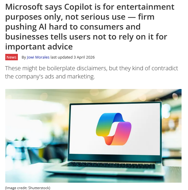https://www.tomshardware.com/tech-industry/artificial-intelligence/microsoft-says-copilot-is-for-entertainment-purposes-only-not-serious-use-firm-pushing-ai-hard-to-consumers-tells-users-not-to-rely-on-it-for-important-advice