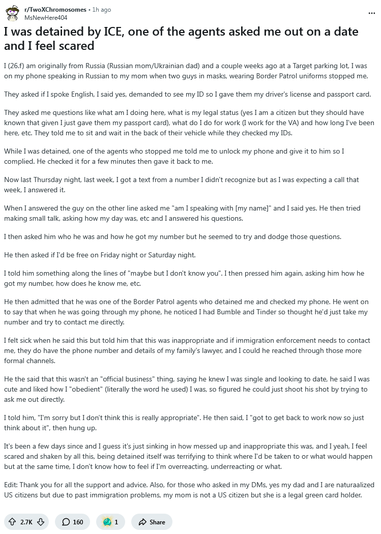 >>530921815nah dude it was creepy. he used his position of authority on a scared woman to score above his league. if the ice agent was hot, she would have said yes. a chad would have asked for her number on the spot and not snoop through her info like a creep while investigating her