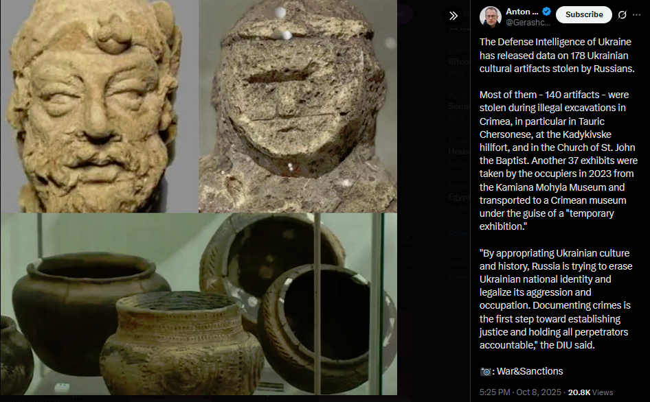 The Defense Intelligence of Ukraine has released data on 178 Ukrainian cultural artifacts stolen by Russians.Most of them - 140 artifacts - were stolen during illegal excavations in Crimea, in particular in Tauric Chersonese, at the Kadykivske hillfort, and in the Church of St. John the Baptist. Another 37 exhibits were taken by the occupiers in 2023 from the Kamiana Mohyla Museum and transported to a Crimean museum under the guise of a "temporary exhibition.""By appropriating Ukrainian culture and history, Russia is trying to erase Ukrainian national identity and legalize its aggression and occupation. Documenting crimes is the first step toward establishing justice and holding all perpetrators accountable," the DIU said.: War&Sanctionshttps://x.com/Gerashchenko_en/status/1975960714410860891