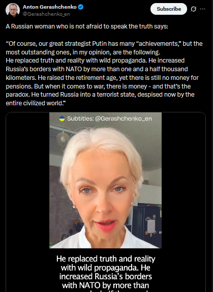 >>518433369>>518432551A Russian woman who is not afraid to speak the truth says 04-10-2025 Of course, our great strategist Putin has many 'achievements,' https://files.catbox.moe/dhl5f3.mp4