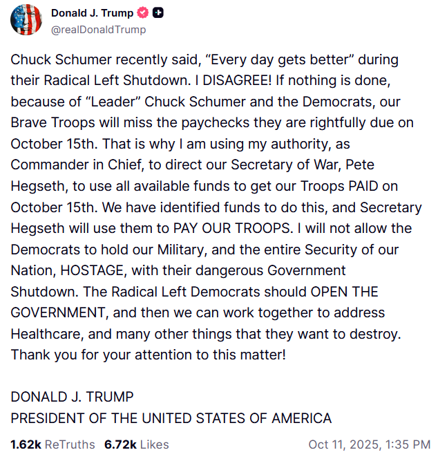 >>518646562Yeah this is bullshit.Troops get paid regardless because that shit is set to go automatically regardless if anyone is in government or not.They set it up to be like that - along with a bunch of other programs - just because of dumb shit like this.Trump is trying to capitalize on an automatic process that was set up a very long time agoI despise commie fuckheads and I would be completely fine with 90% of the government just being fucking fired, even though I know the millions of government parasites and glownigger faggots will be out here competing with me for finite employment opportunitiesBut if it fucks them over and gets stops this shit? I'm okay with that.