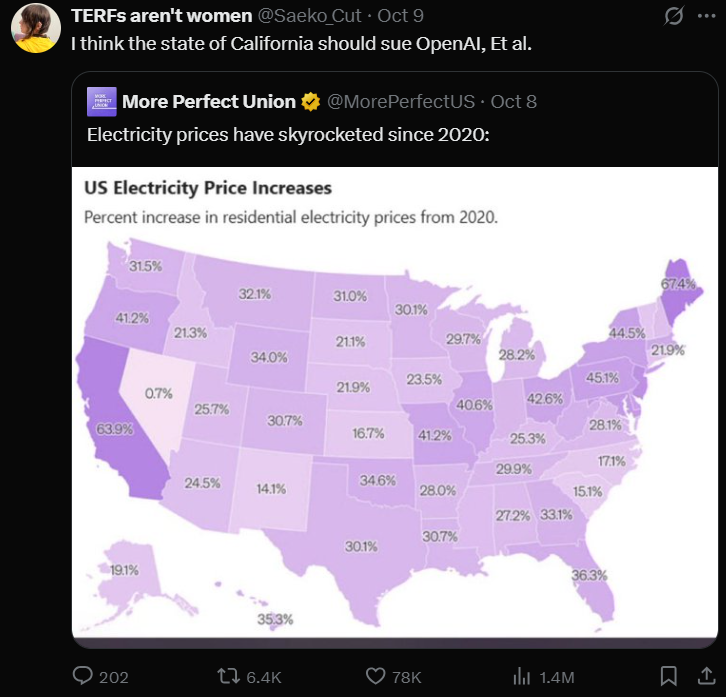 >>518646652CA's increase is higher than WA's but we always had higher rates to start with, thanks to supporting all the techbro BS. Meanwhile, as we're forced to carry Tech on our necks, the rivers keep flowing. The other big electron sucker is Big Pot. They built IMMENSE subsidized facilities that devour electricity. Overbuilt. Meanwhile every "green" gadget on earth has a vacuum hose in my household's budget, sucking hard. Sick of it. Don't even get me started on the taxes attached to it all.